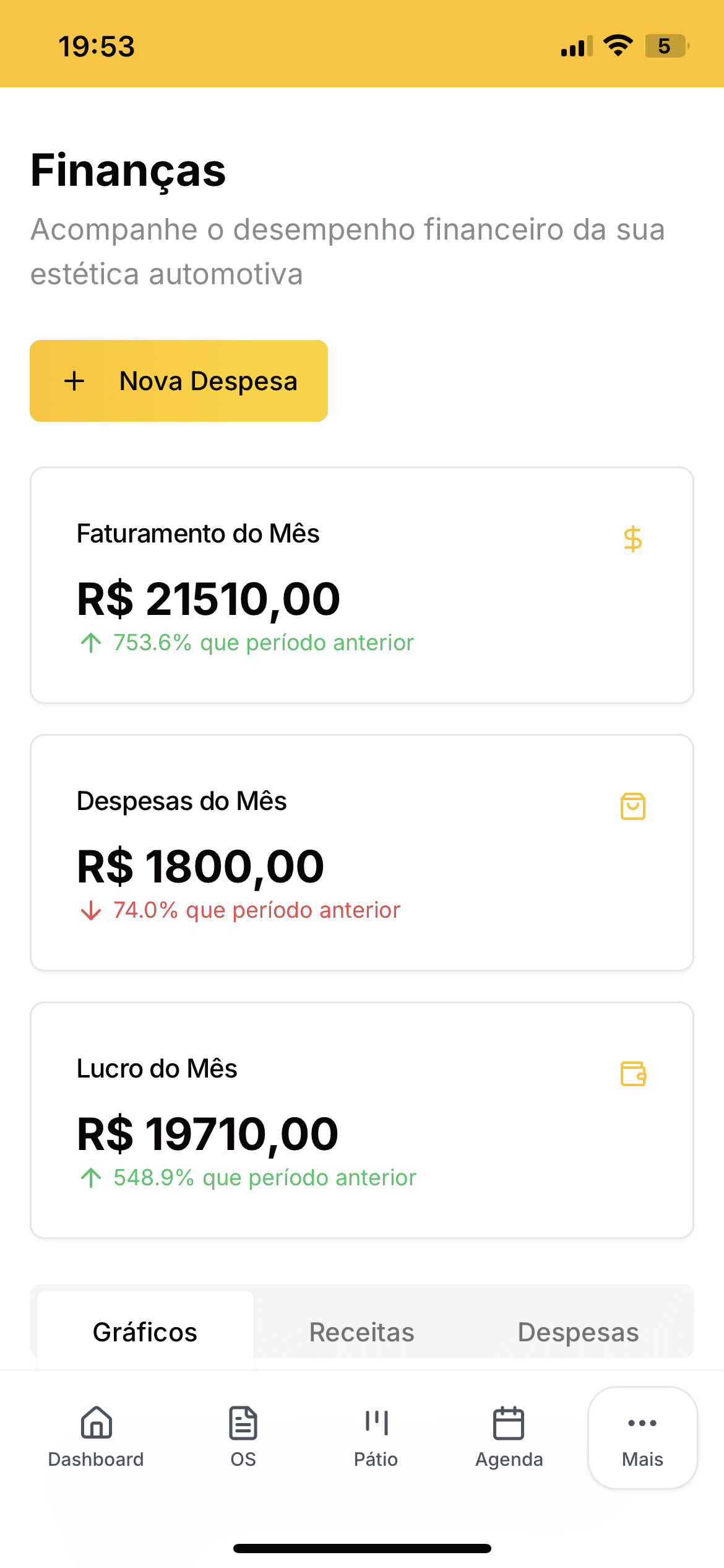 Saiba exatamente quanto entrou, quanto saiu e quais serviços mais geram lucro. Você no controle de verdade.