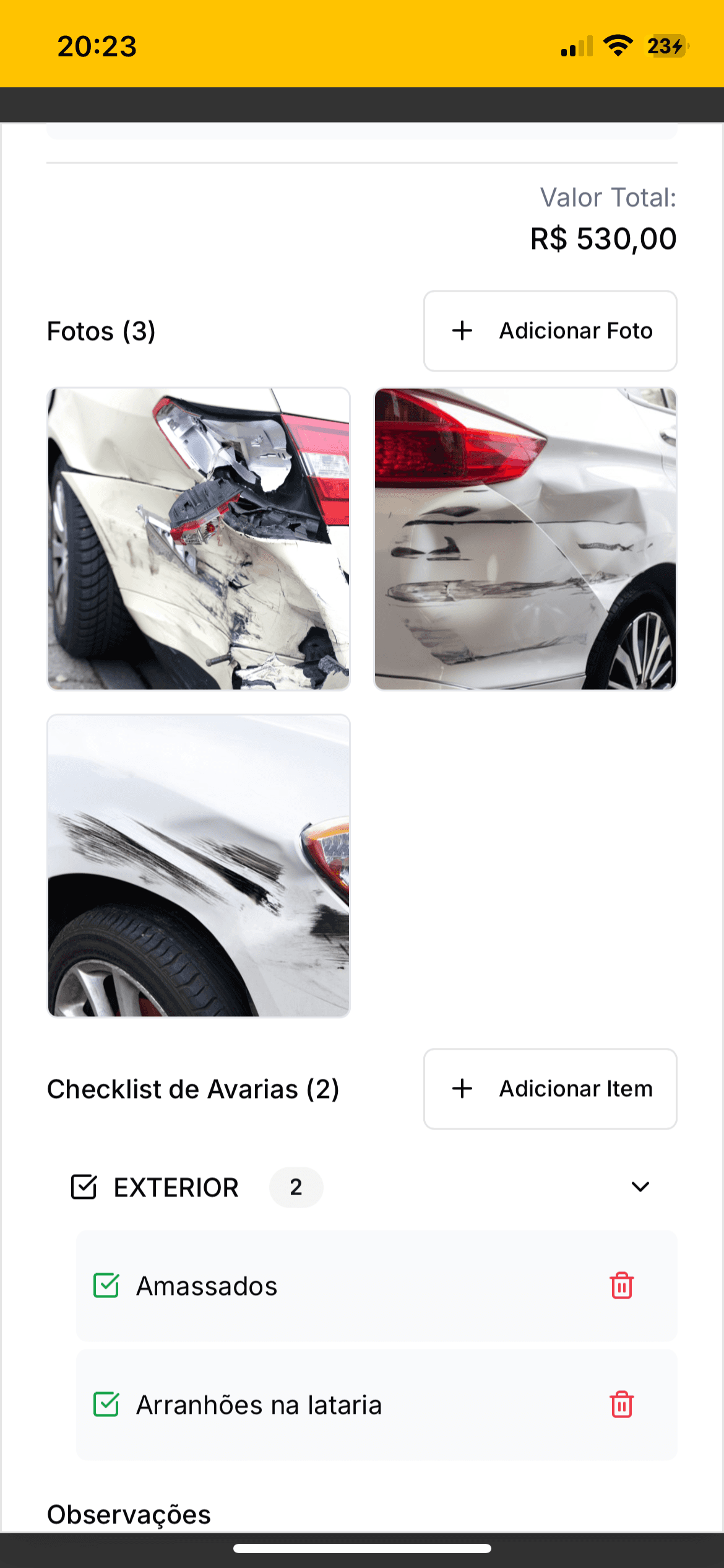 Checklist visual e fotos anexadas