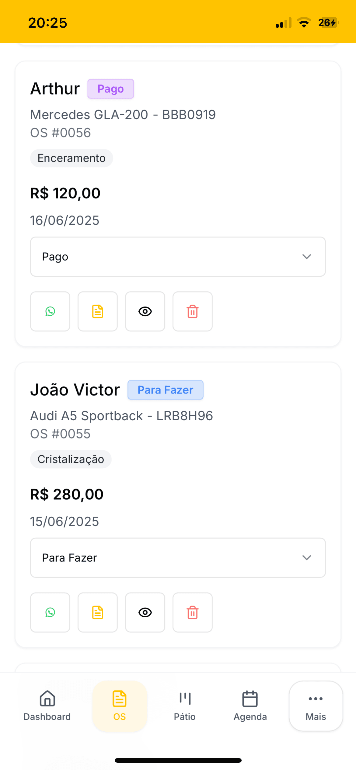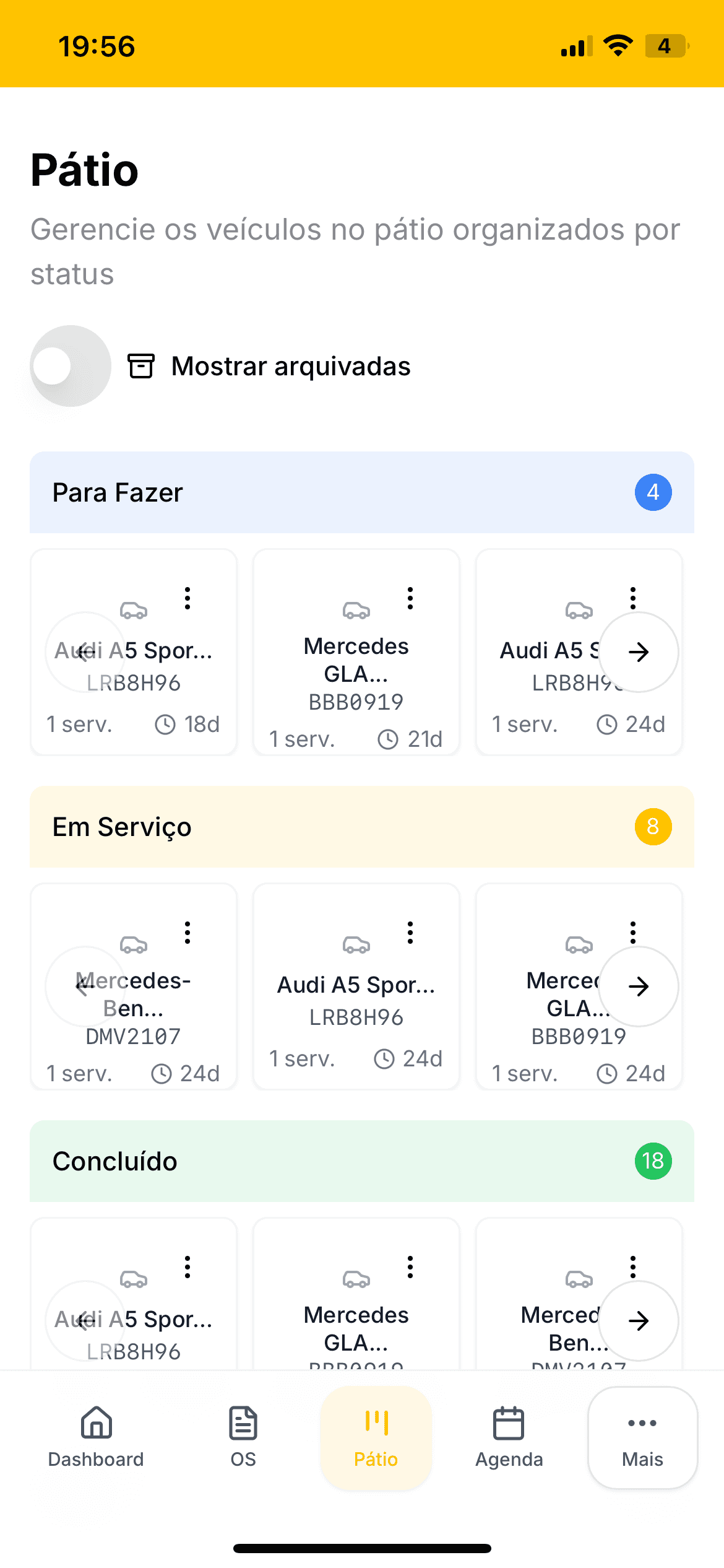 Tem vários carros no pátio e precisa de uma forma simples de acompanhar o status de cada serviço.